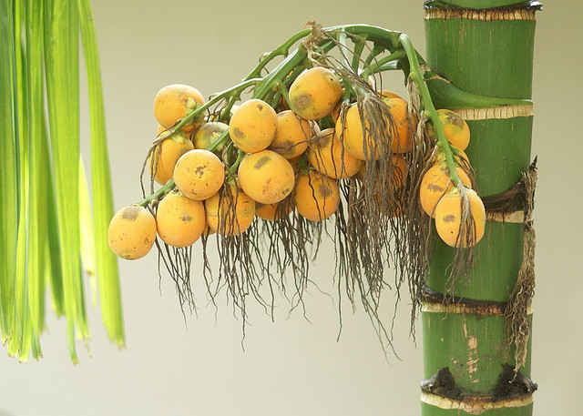 Palm tree grows in warm areas of Asia to get results when young yellowish green color, size approximately the size of chicken eggs, which contain particles sized particles of beech effect, with conical bottom flat and light brown color exterior; inside speckled like nutmeg. Its results are complementary (or cut) into thin slices rolled in betel leaves and betel baptized into lime.